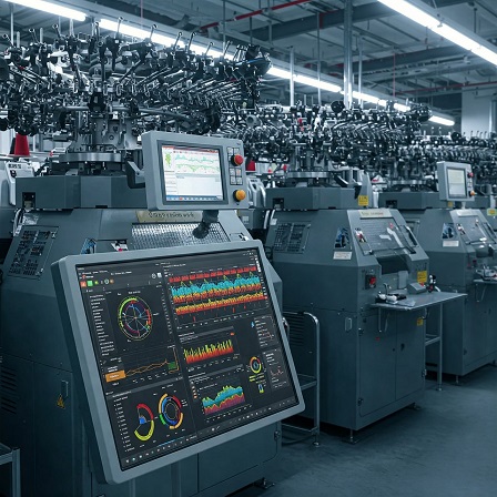 This compelling image offers a glimpse into a modern textile manufacturing facility, specifically highlighting a series of advanced knitting machines that are deployed worldwide. The foreground prominently features a sophisticated, customized HMI (Human-Machine Interface) panel, displaying a rich array of real-time data visualizations, including graphs and charts. These bespoke HMI solutions are meticulously designed to provide operators with intuitive and comprehensive oversight of critical machine parameters. From monitoring production rates and material consumption to identifying potential anomalies and ensuring product quality, these panels are indispensable tools for optimizing the efficiency and performance of complex industrial knitting processes across the globe. Their adaptable design ensures seamless integration into diverse operational environments.